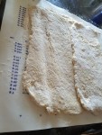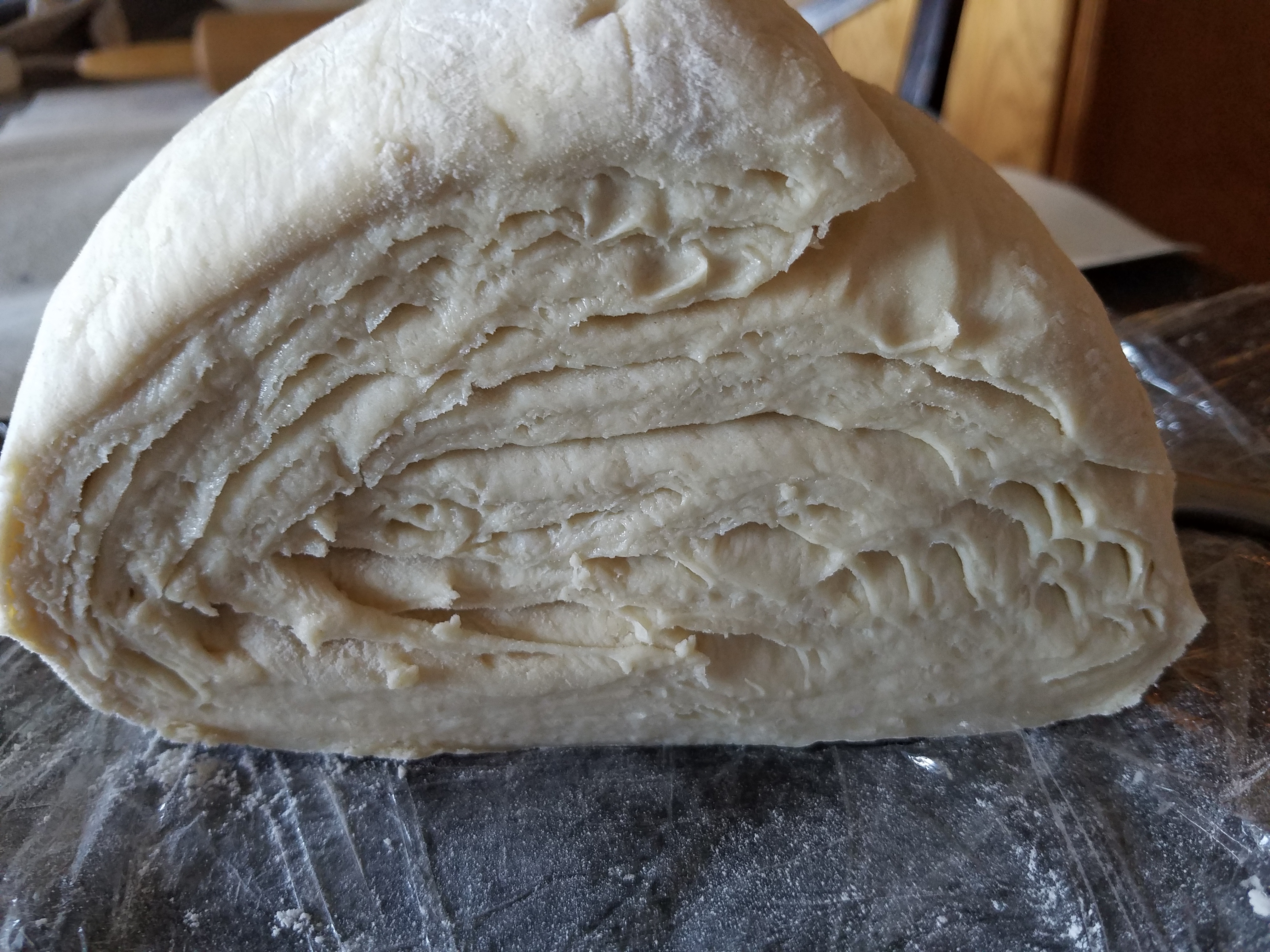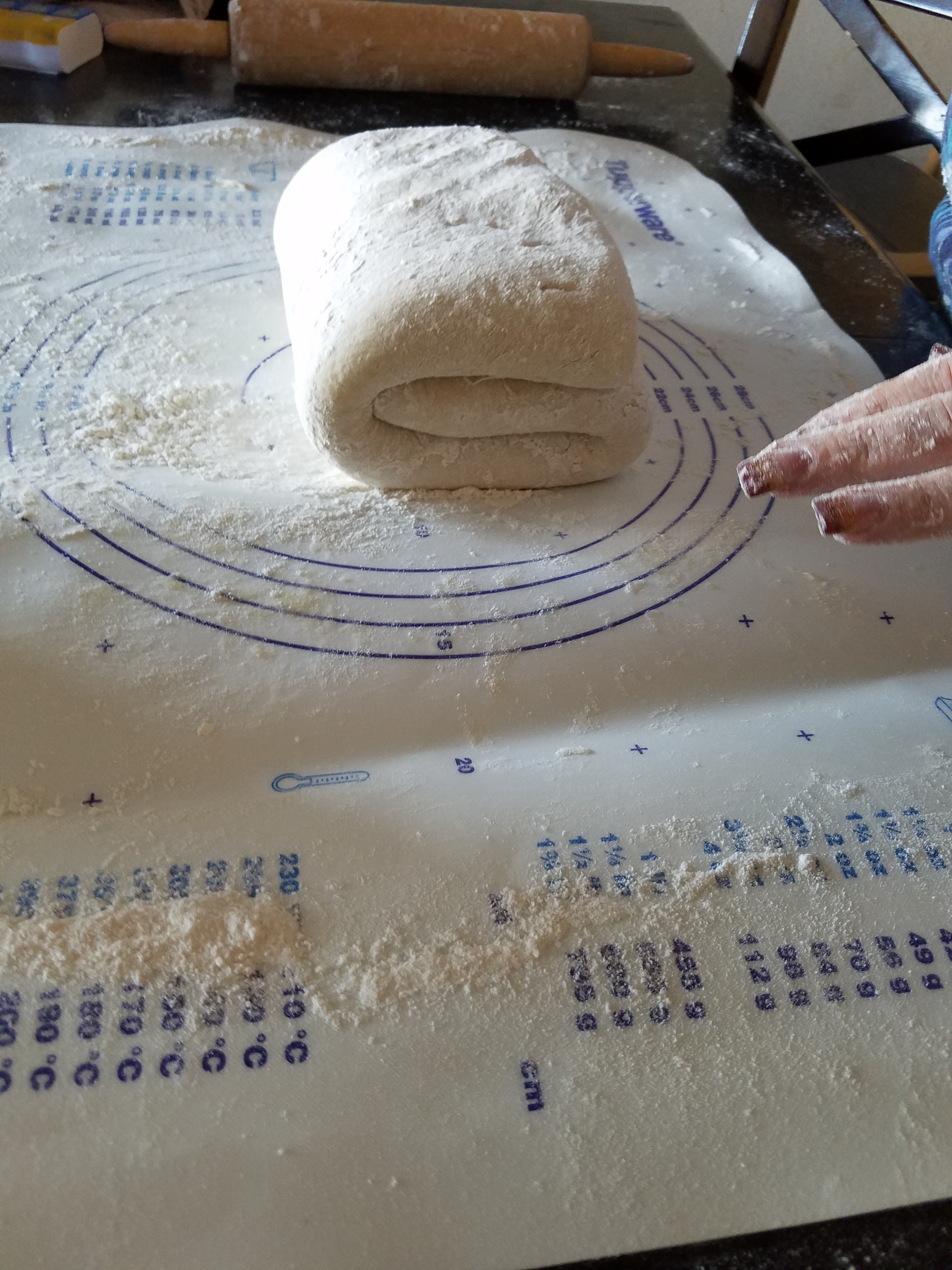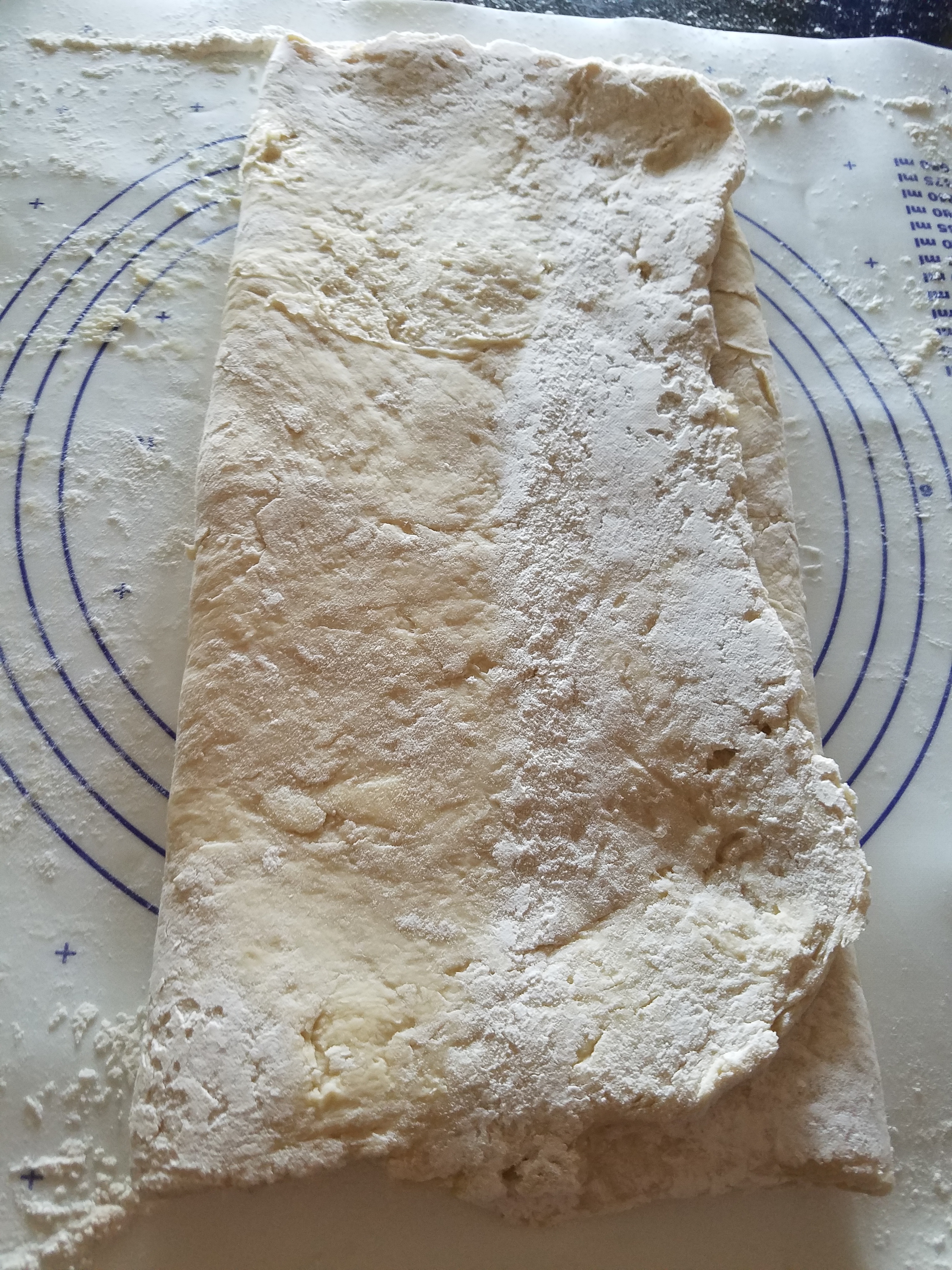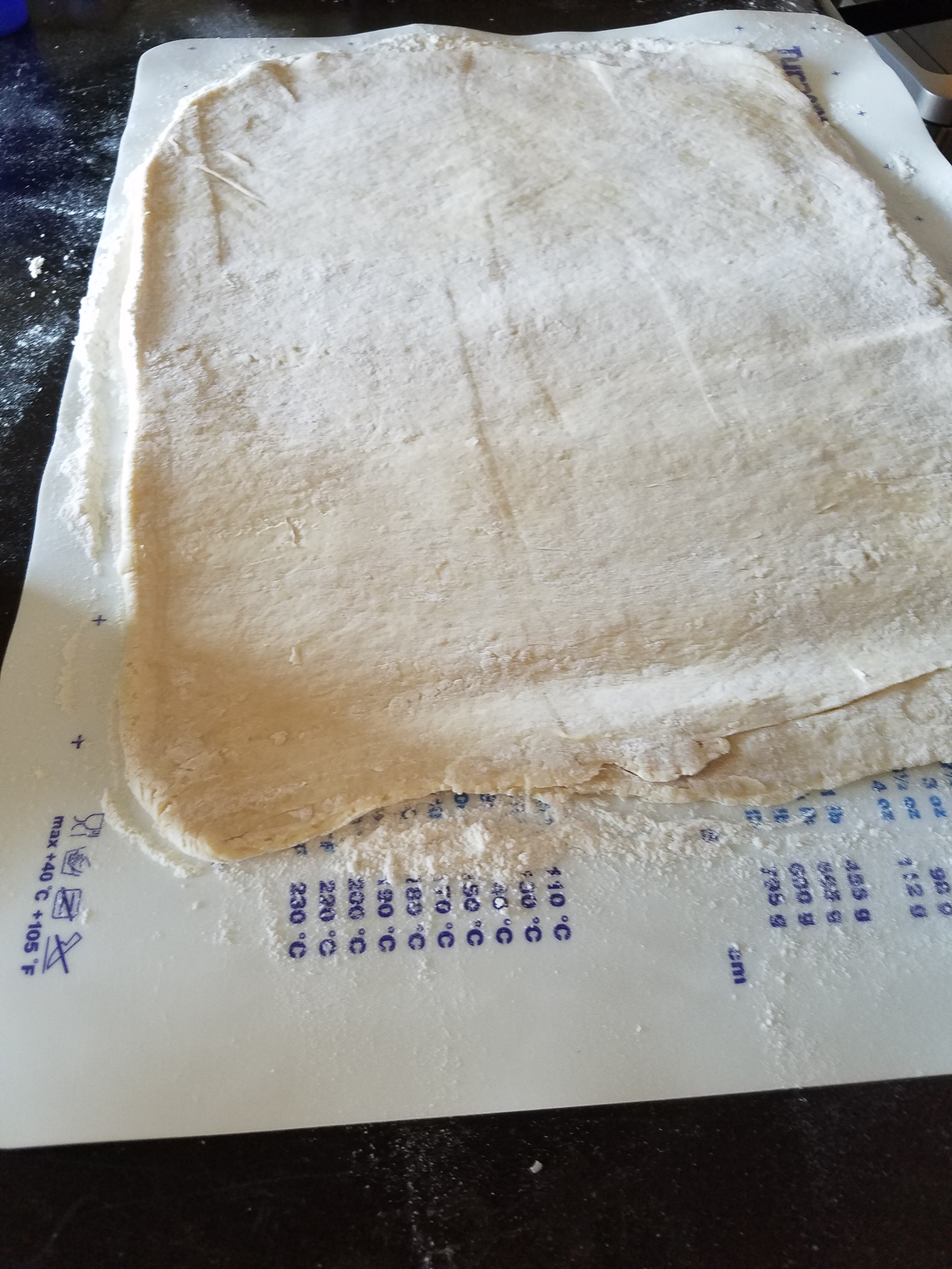 - On a floured surface gently flatten the dough with your hands into a small square. Lightly flour over the top and roll out into a 15 inch long rectangle using a rolling pin. lightly flour and fold 1/3 of the dough over and then over again as if folding a letter to place in an envelope. Roll out into a 15 inch long rectangle and lightly flour and fold 1/3 of the dough over and then over again. Roll out into a 15 inch long rectangle and repeat again.