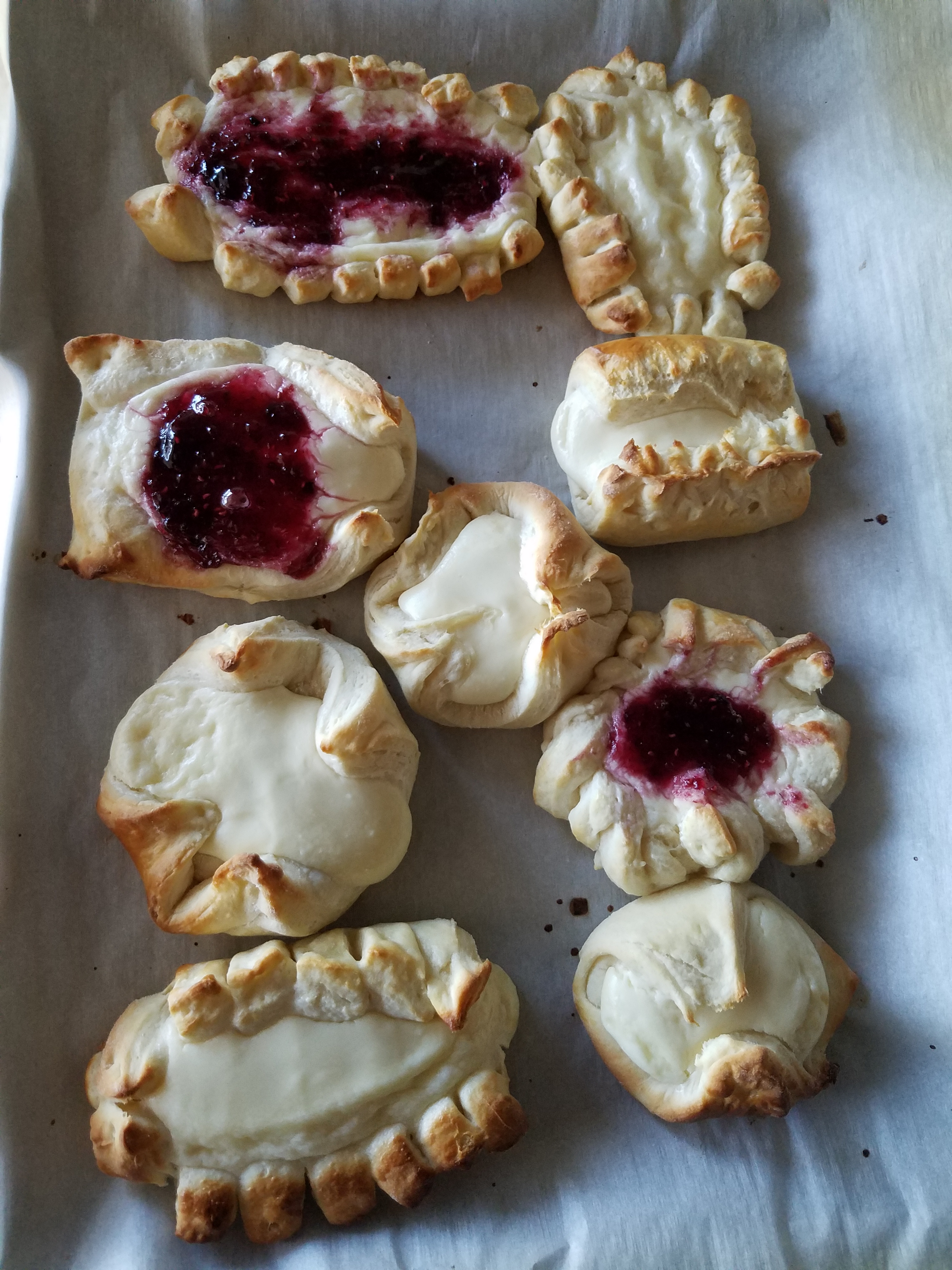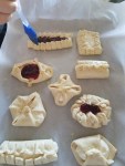 - Remove dough from the refrigerator and divide in half. Put the half you are not working back in the refrigerator. Roll out into a 1/4 inch thickness. Cut into squares or rectangles. Add filling and fold edges over decoratively.