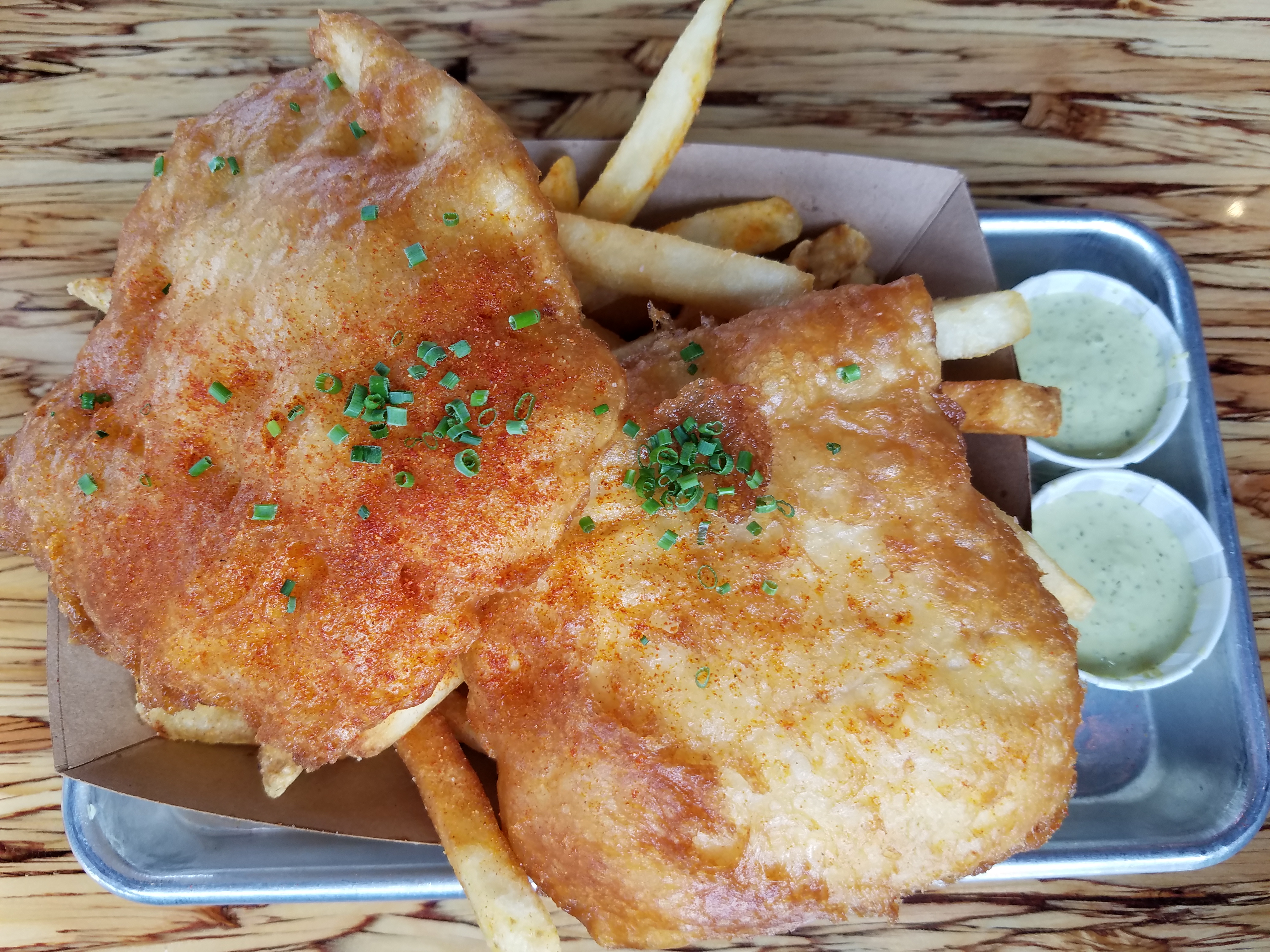 L- The Fish and Chips were AMAZING and my favorite dish. It took me back to the Fish we had in England 17 years ago this week. The better was lite, crispy goodness and the fish was moist and flaky. The chips where not true English Chips but rather Fries dusted in Chili Powder. Their tartar sauce was fantastic. Their Fry Sauce or rather Awesome Sauce as they call it has a hint of Lime as well as Chili Powder to it.