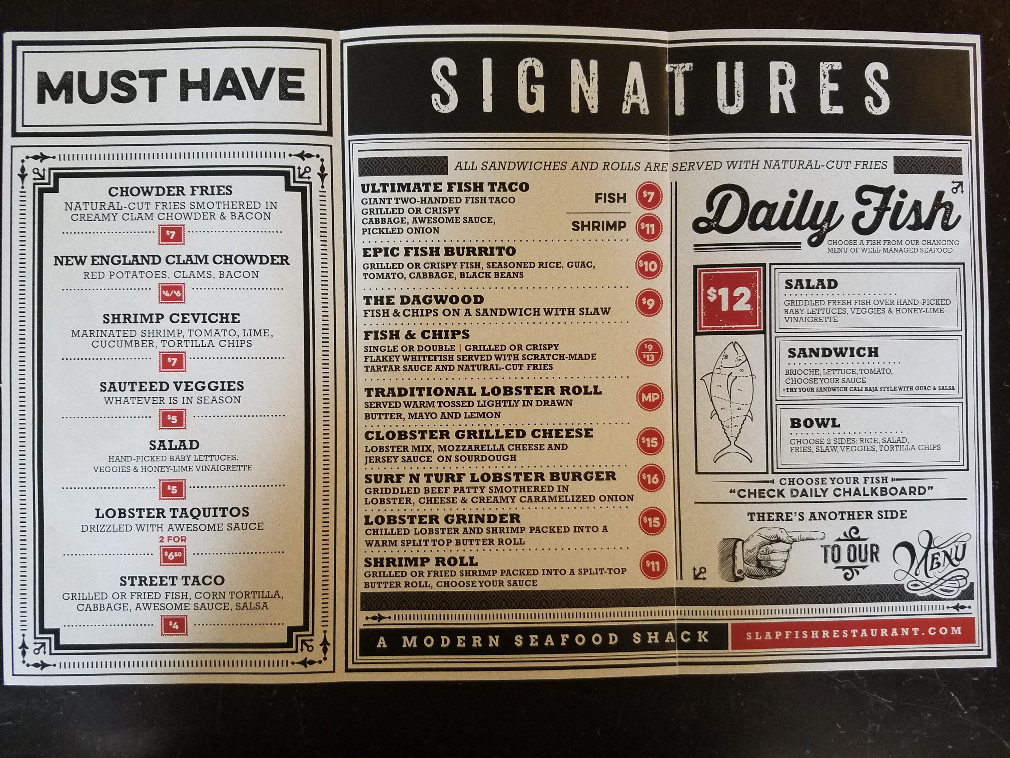 When we could not decide where to go for lunch with our oldest two we came upon Slapfish. After checking out there menu online we decided to give it a shot, I am happy to say, it was definitely worth it and a pleasant surprise. We selected 5 items to share between the 4 of us, Below we will review of each of them. If you are looking for good seafood and quick friendly service I would highly recommend Slapfish.