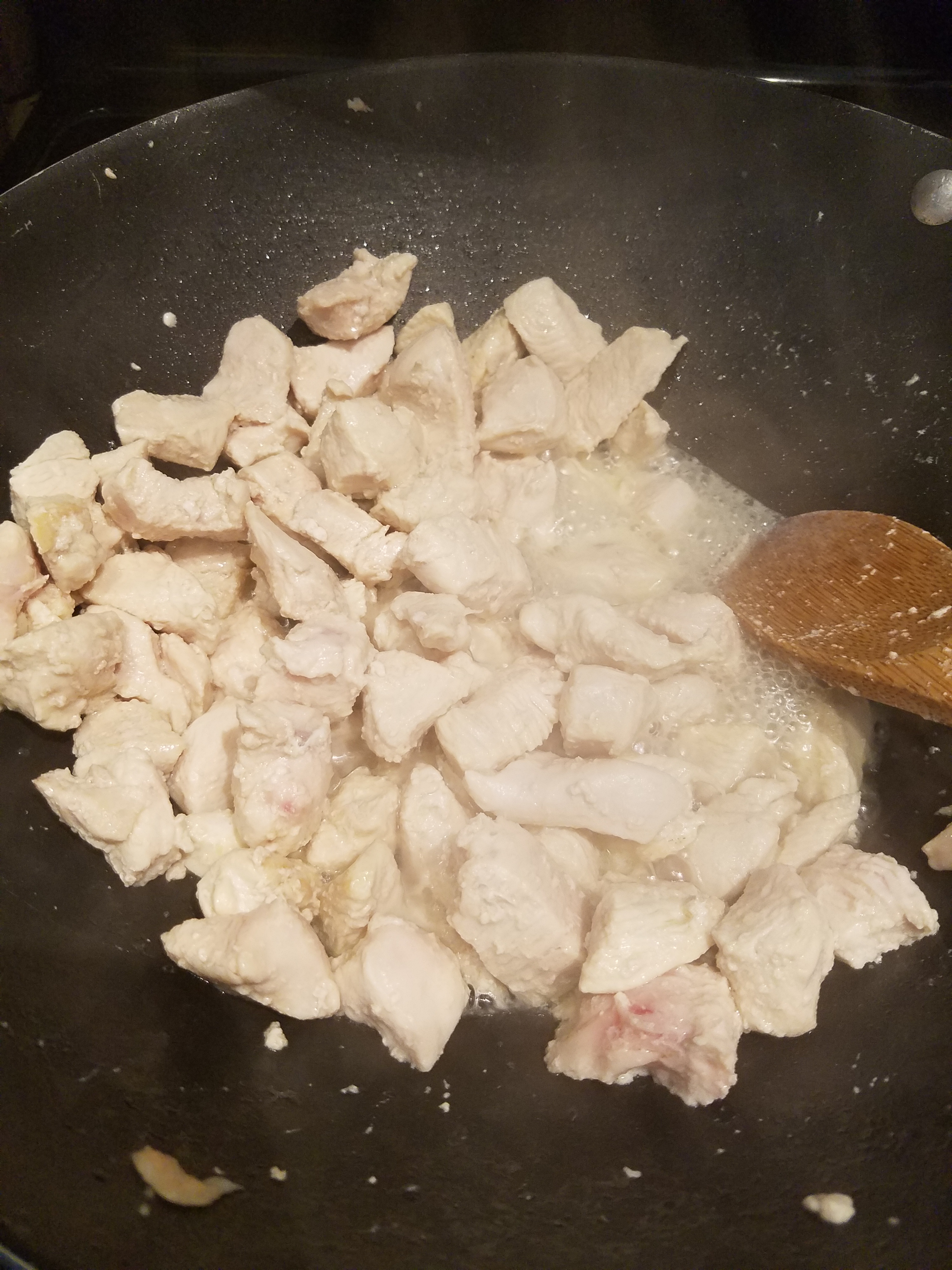 Cut Chicken Breasts into bit size pieces. Brown in wok with Peanut Oil.