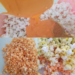 Air pop 12 cups of popcorn for each color/flavor place in large bowl. In a glass or ceramic microwave safe bowl melt one color of candy melts at a time on half power for 2 minutes. Stir and return to the microwave on half power for an addition 1-2 minutes until melted. Add the essential oil and Stir. Lemon in yellow. Wild Orange in orange. Lime in green. Pour candy melts over the 12 cups of popcorn and stir until all of the popcorn is coated. Pour out on to waxed paper. Repeat for the next to colors. Allow 20 – 30 minutes for the candy melt to set. Combined all three flavors together.