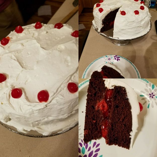 Cut cake rounds so they are flat on the top. Place the first cake on to a cake tray. Cover with pie filling make sure it does not run over the edge. Top with second cake layer. Cover with whipping cream. Decorate with maraschino cherries. Refrigerate if not serving immediately.