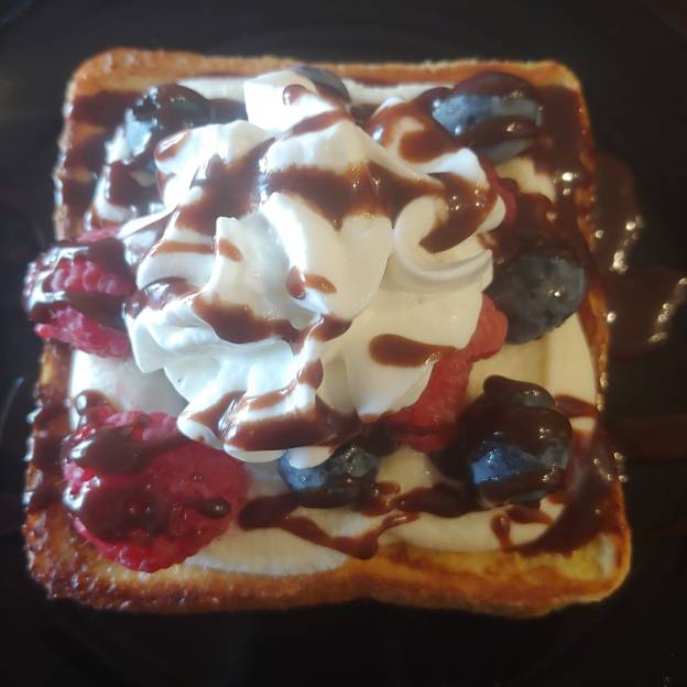 Beat together eggs, milk, and vanilla. Heat a lightly oiled griddle or skillet over medium-high heat. Dunk each slice of bread in egg mixture, soaking both sides. Place onn pan, and cook on both sides until golden. Top with cannoli cream, then berries, whipping cream and then drizzle with chocolate gnocchi.