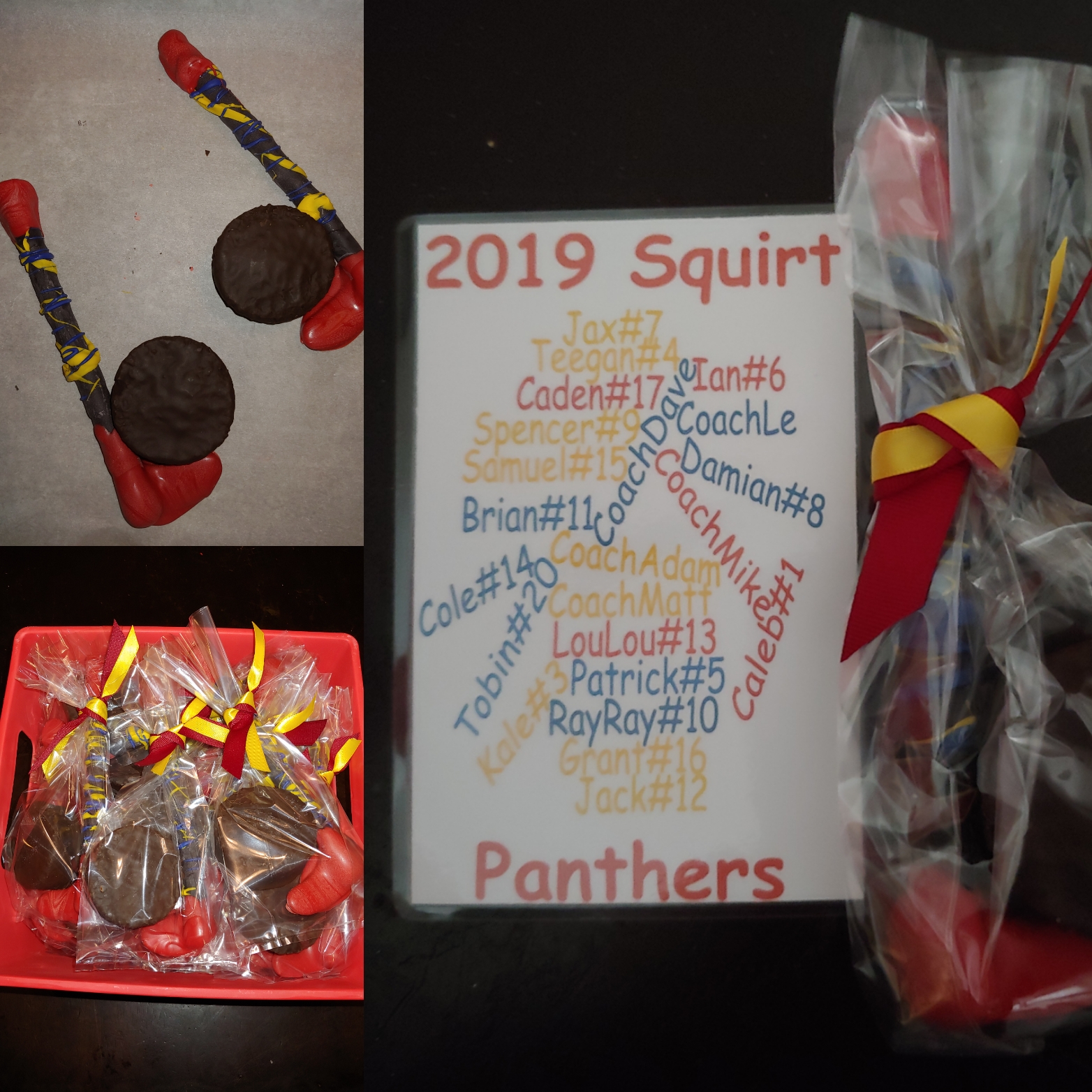 Two weeks ago, my son asked me to do sticks with pretzel rods drizzled with his team colors and pucks from Ding Dongs for his team treats. After spending two days dipping, drizzling, shaping, and dipping, my son said, “they look awesome, but I just meant dipped pretzel rods drizzled with my team colors.” They turned out cute, but man they were a lot of work. Totally over thought this one!