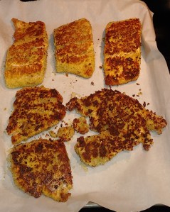 Repeat with each piece of Salmon adding bread crumbs as needed to the bowl. (Unused bread crumbs that have not be in the dipping bowl can be frozen for another time.)