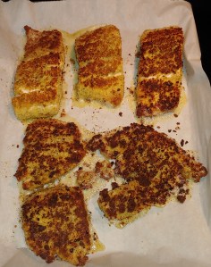 Preheat a large skillet to Medium High with 2-3 T of Olive Oil to sear the Salmon. One piece at a time dip into the egg mixture coating completely. Allow excess eggs to drip back into the bowl. Immediately dip in bread crumb mixture coating completely.