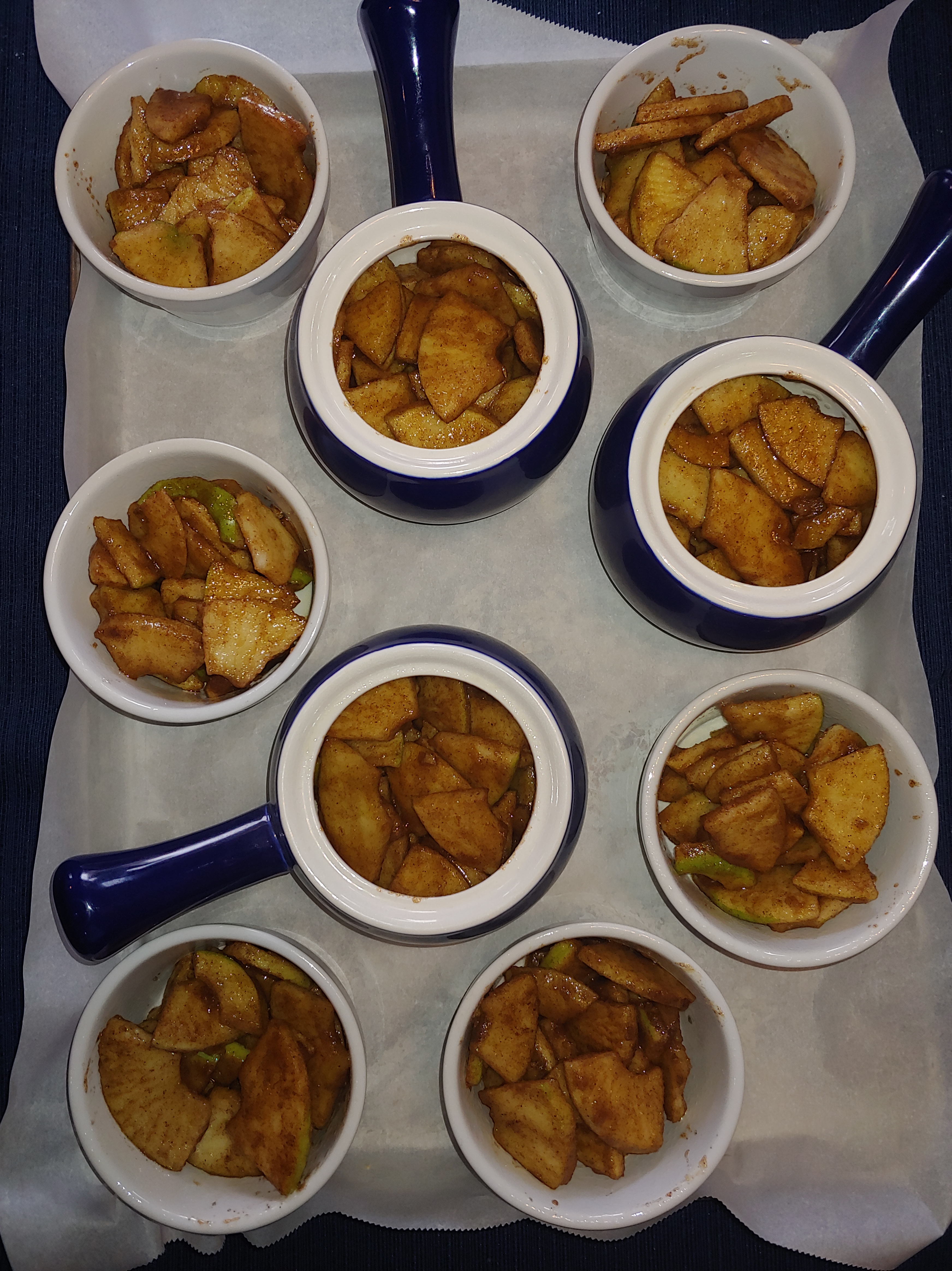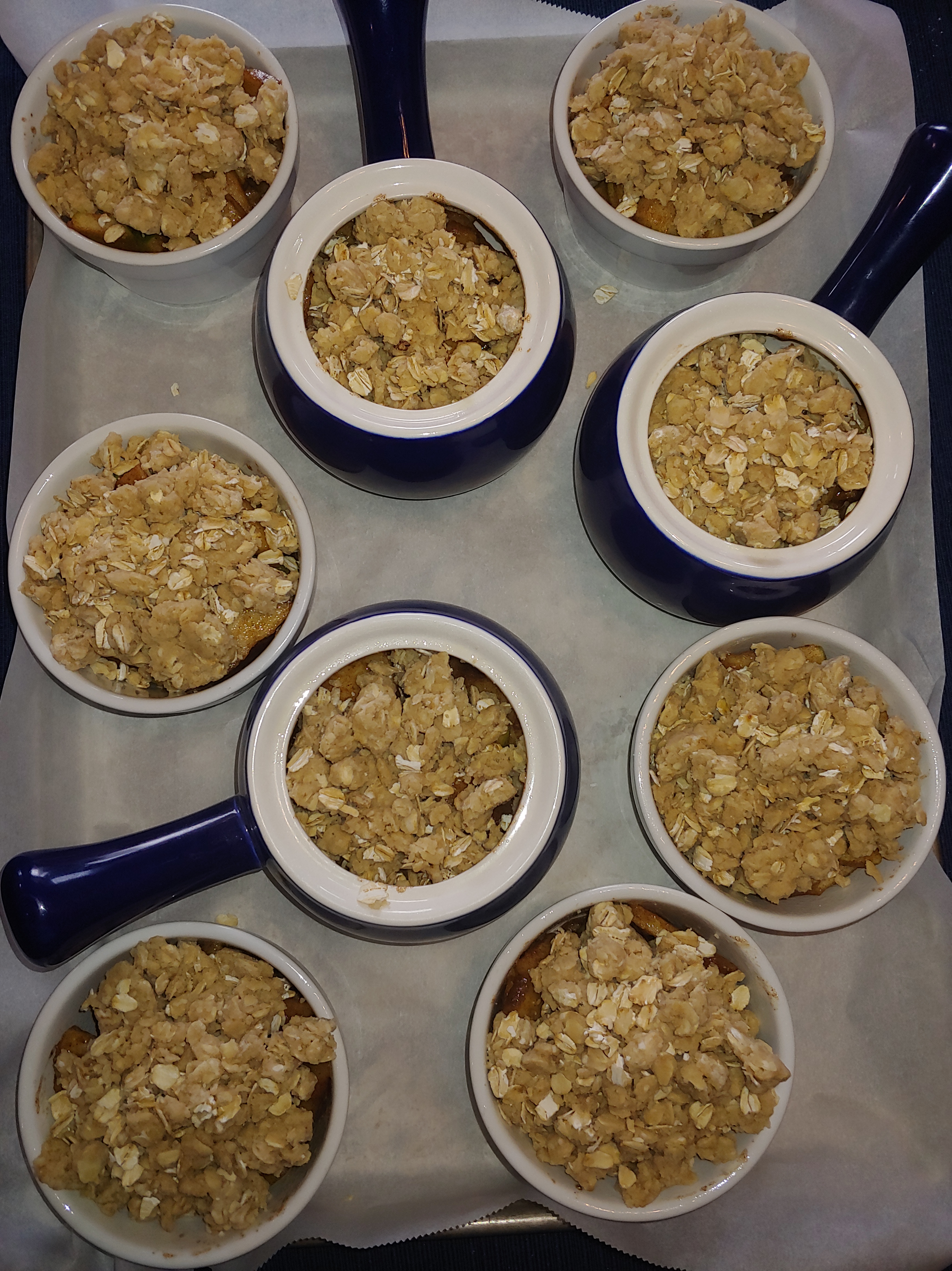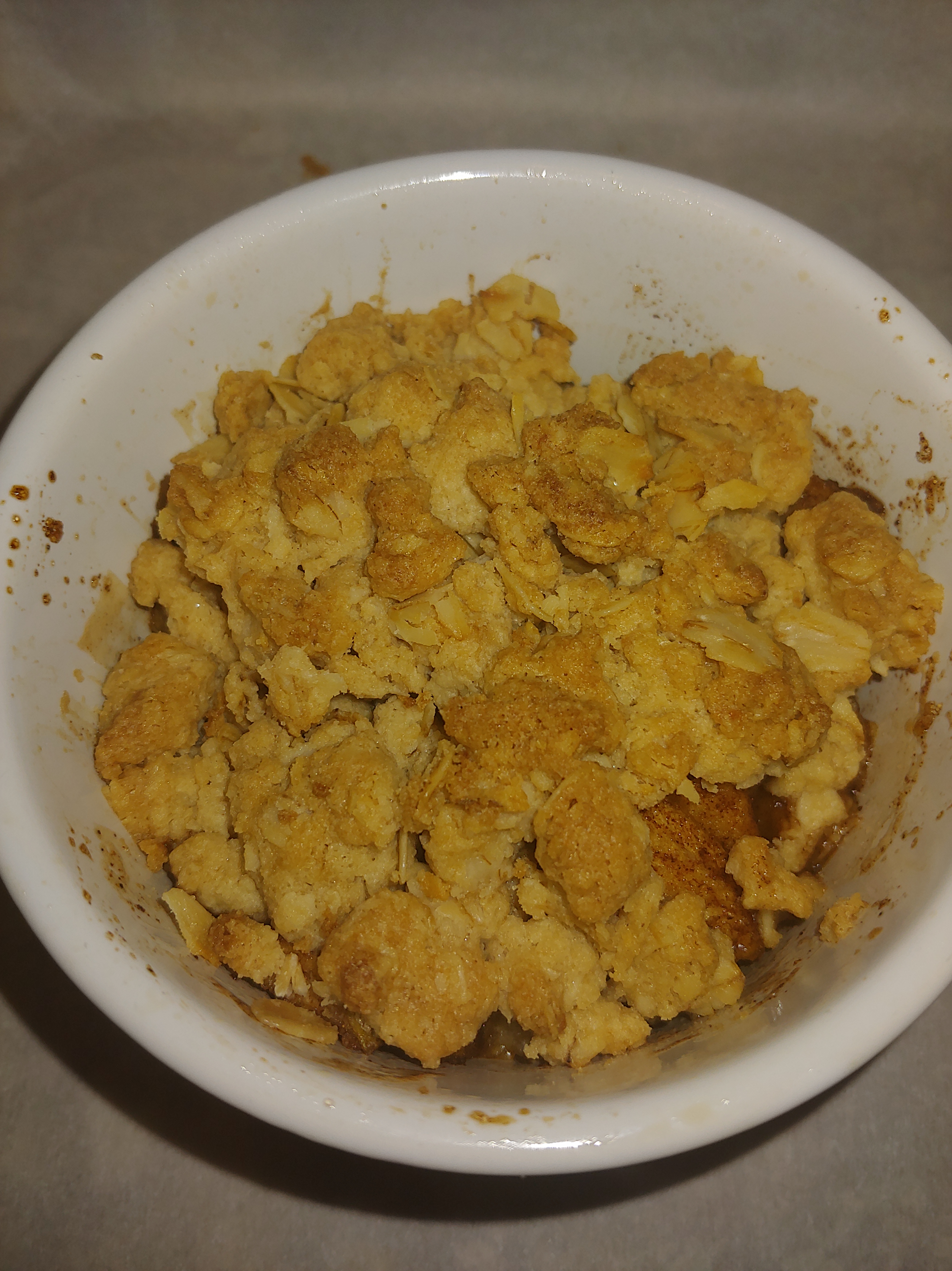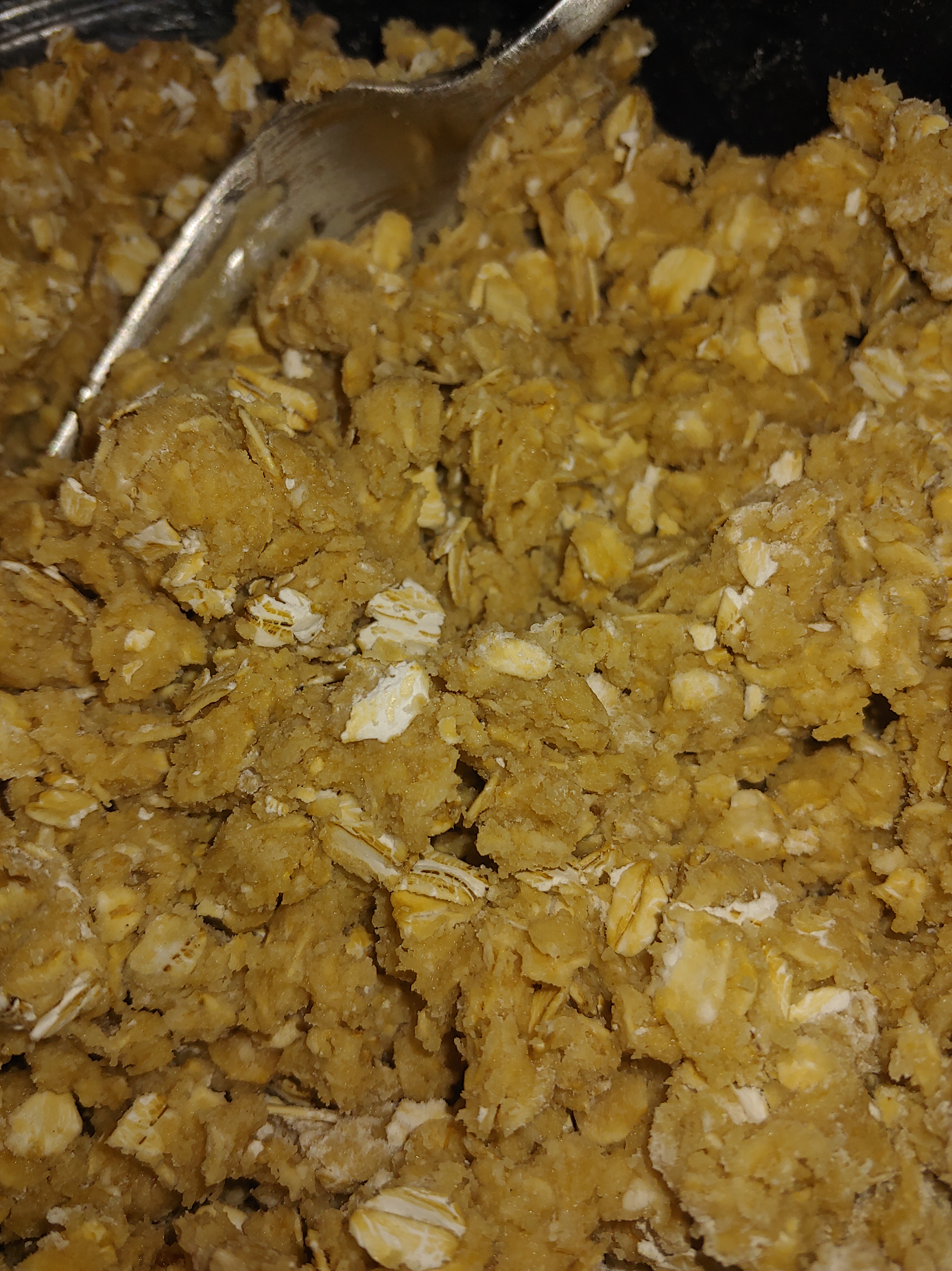 With a fork combined all ingredients into a crumble. Place the apple filling in the pan or cups. Top with the crumble mixture. Bake for 20-30 minutes until golden brown.