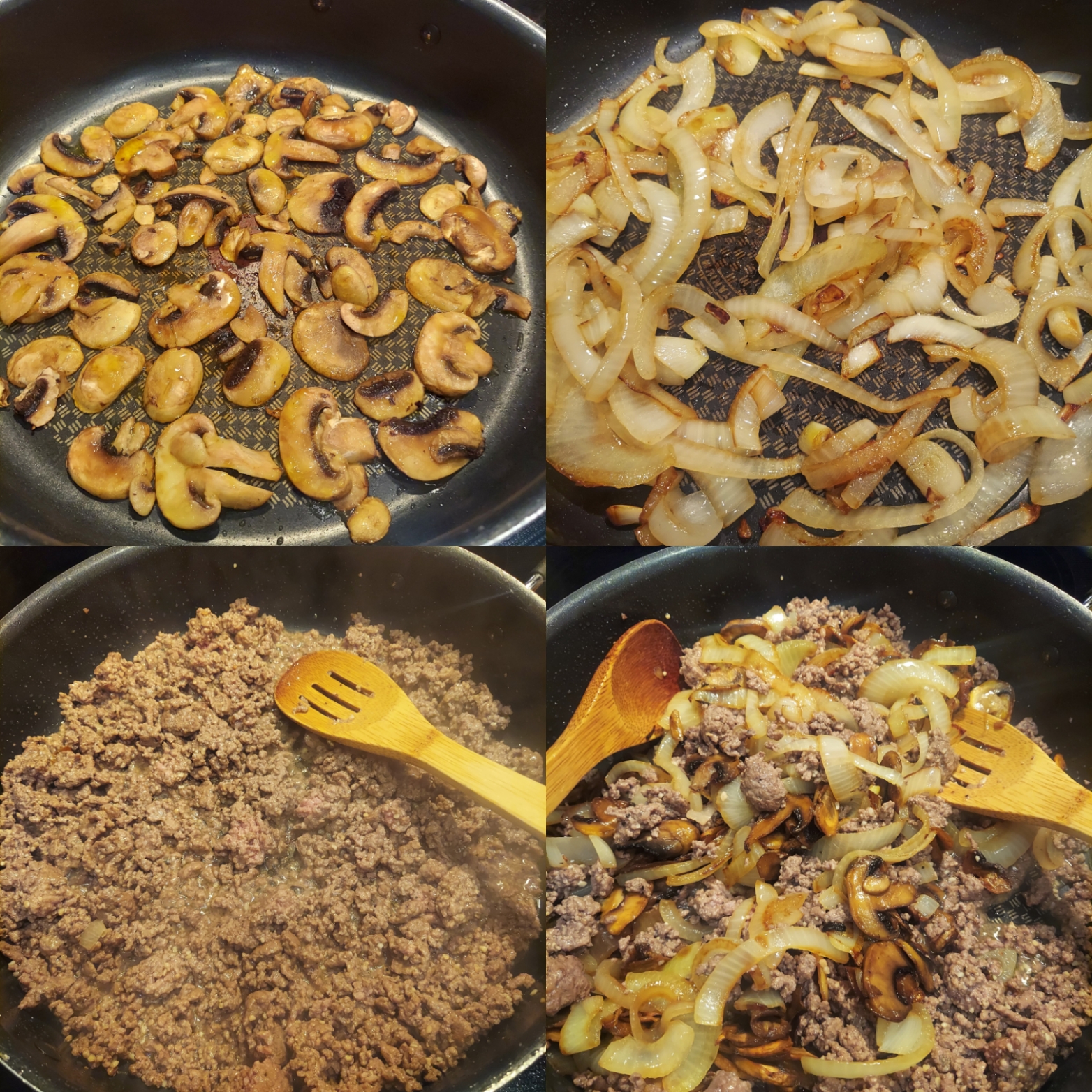 Sautee Mushrooms then set aside, Sautee Onions until caramelized then set aside. Brown Ground Beef with garlic and black pepper while cooking egg noodles. Add in mushrooms, onions, cream of mushroom soup, and Sour Cream. Drain noodles and stir into sauce.