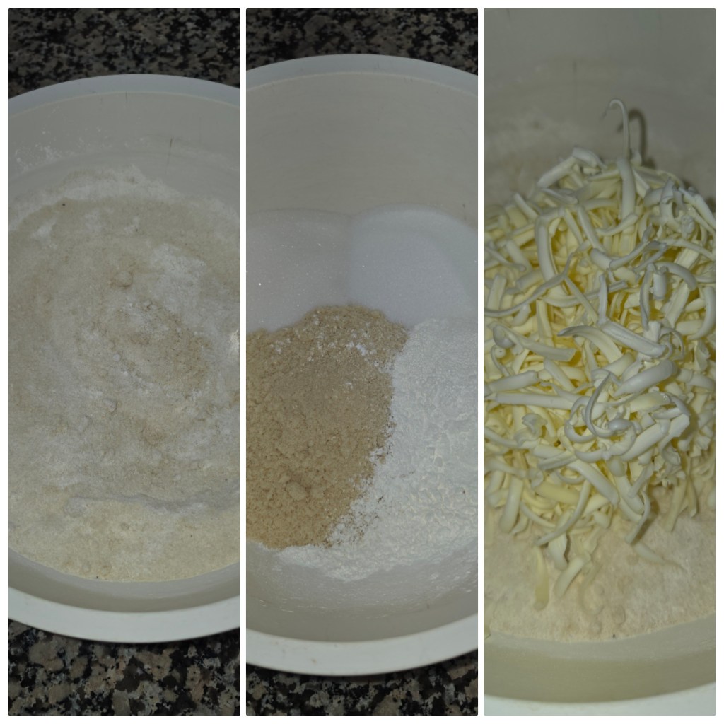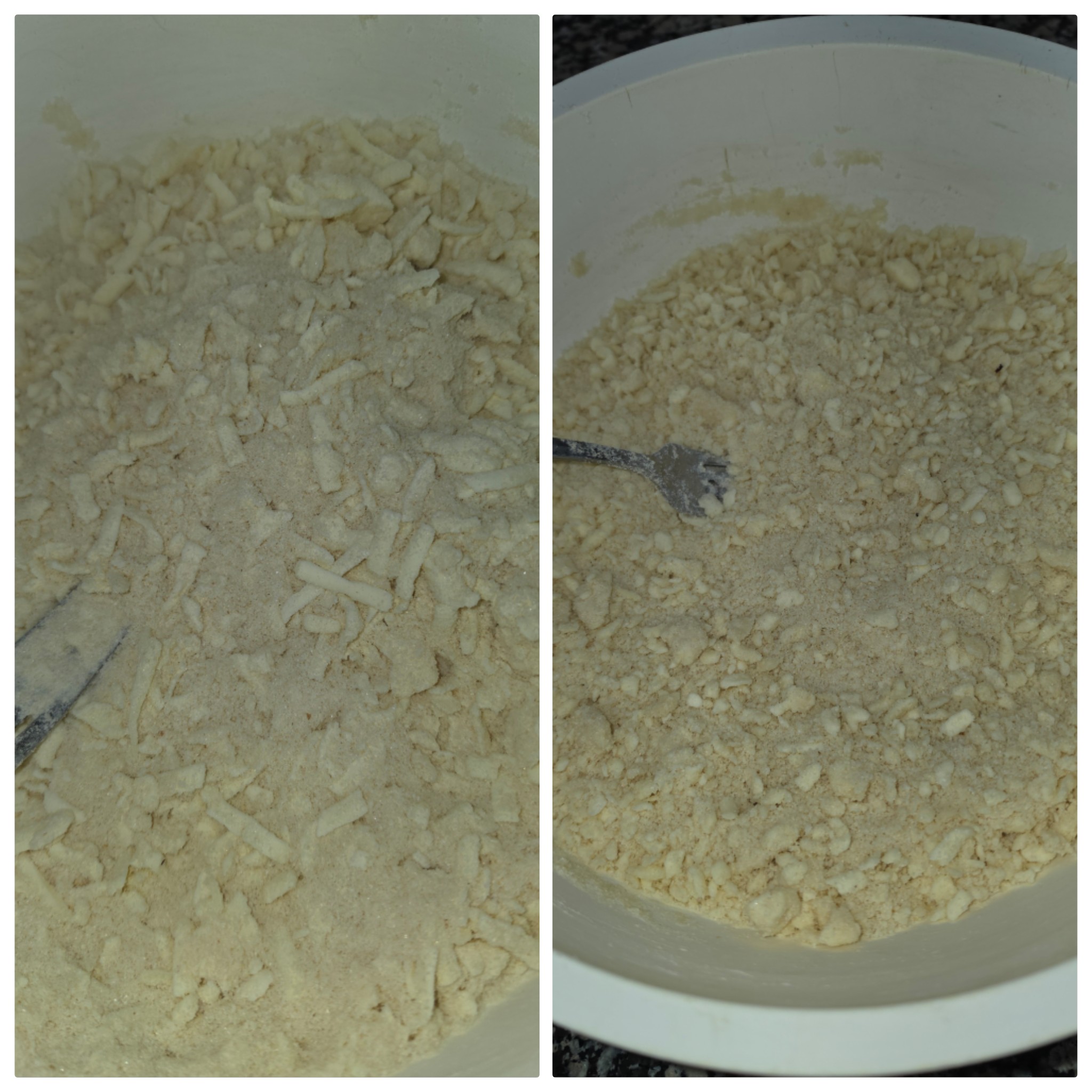 Mix flour, corn starch, monk fruit, and sugar. Create butter into dry ingredients. Use a pastry cutter or fork to break up butter and incorporate it into the dry mixture.