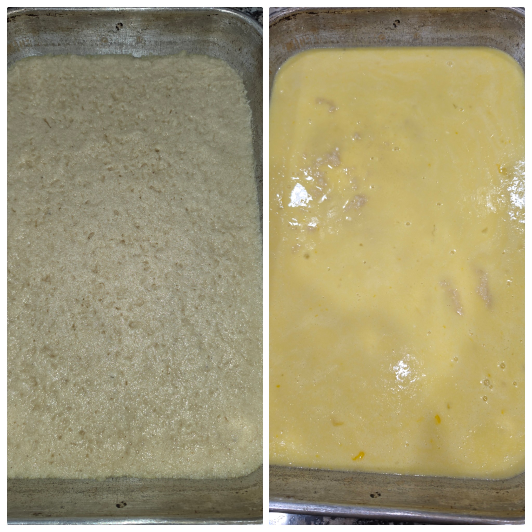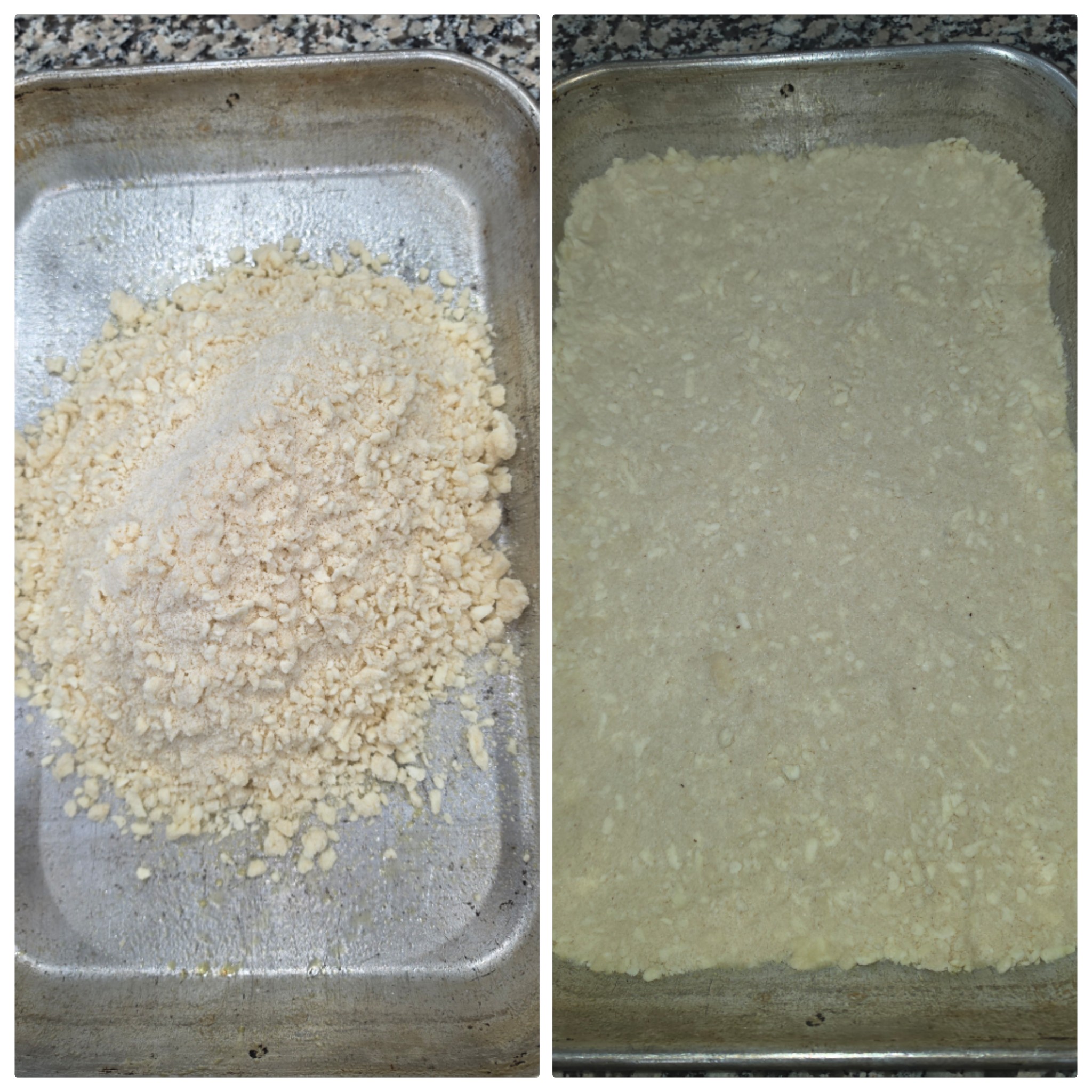 Press into a 17″ x 11″ cake pan or casserole dish. Bake for 10 minutes.