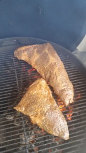 Cook. Smoke over indirect heat at 225°F until the internal temp is 150°F, about 2 hours. You can use any wood you like. Hickory is the tried and true. I’m partial to cherry and applewood. After smoking you should slice off the ends, which may be very dark and more heavily seasoned, and taste them right away. They will be more salty than the innards and the fat will be a bit stringy, but you’ll love it all the same. Just wait til you cook up an inside slice!