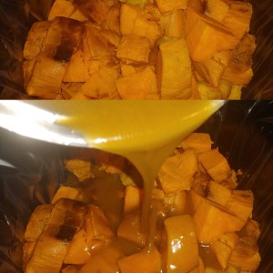 In a skillet start to brown the bacon cubes on all sides. Little steam Brussel sprouts for 2 minutes, drain and set aside.