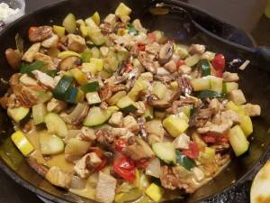 In a large cast iron skillet. Grill cubed chicken over medium heat. Remove from a pan. Saute onions until caramelized.  Remove from pan and add to chicken. Saute mushrooms. Return chicken and onions to the pan. Stir in zucchini and yellow squash and cook for 5 minutes. Add in nuts and tomatoes. Cook 2 – 3 minutes. Stir in 1 cup Goat Cheese just before serving.  Sprinkle with additional Goat Cheese when serving. We enjoy it with Pita Bread.