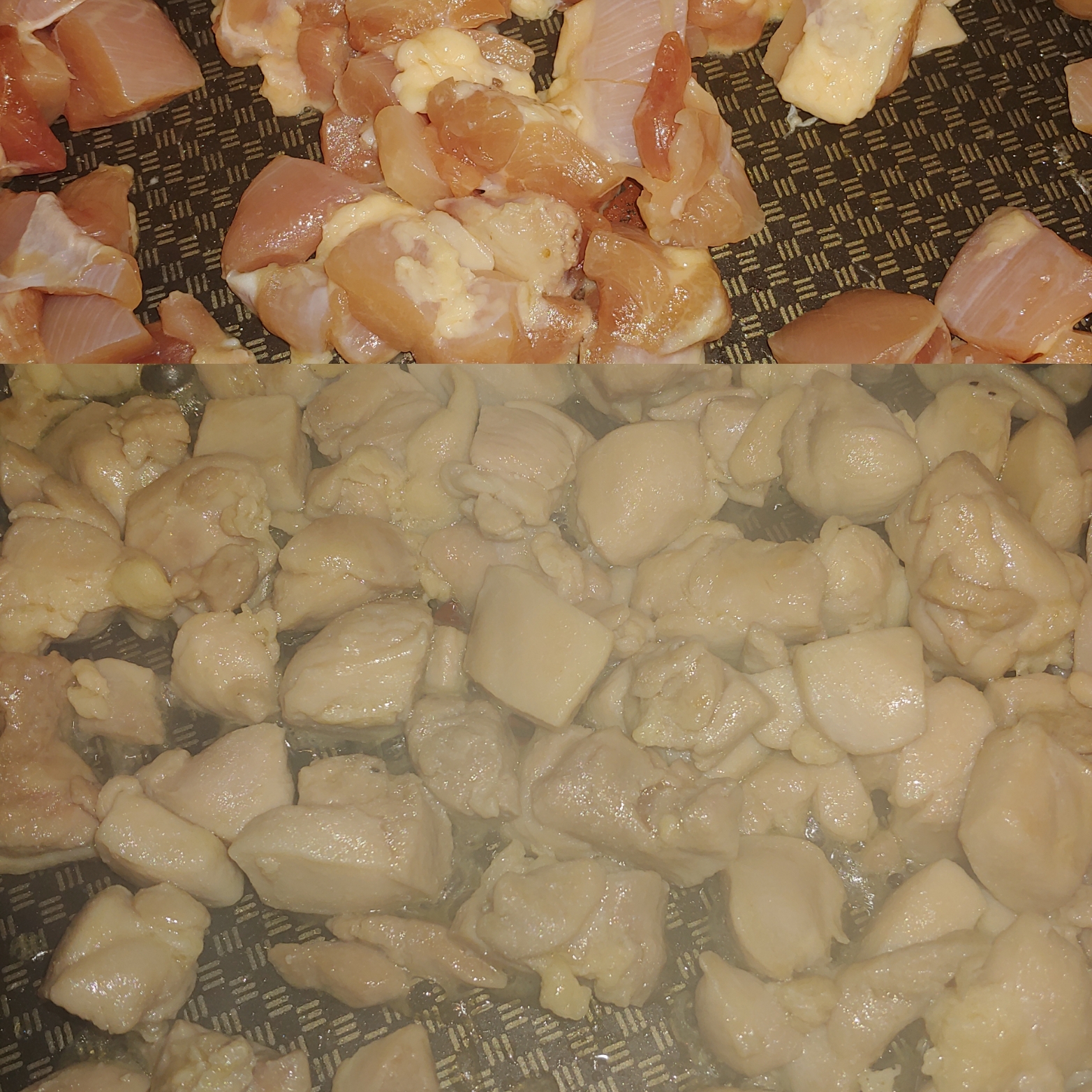 Cut Chicken Breasts into bit size pieces. Brown in wok with Peanut Oil.