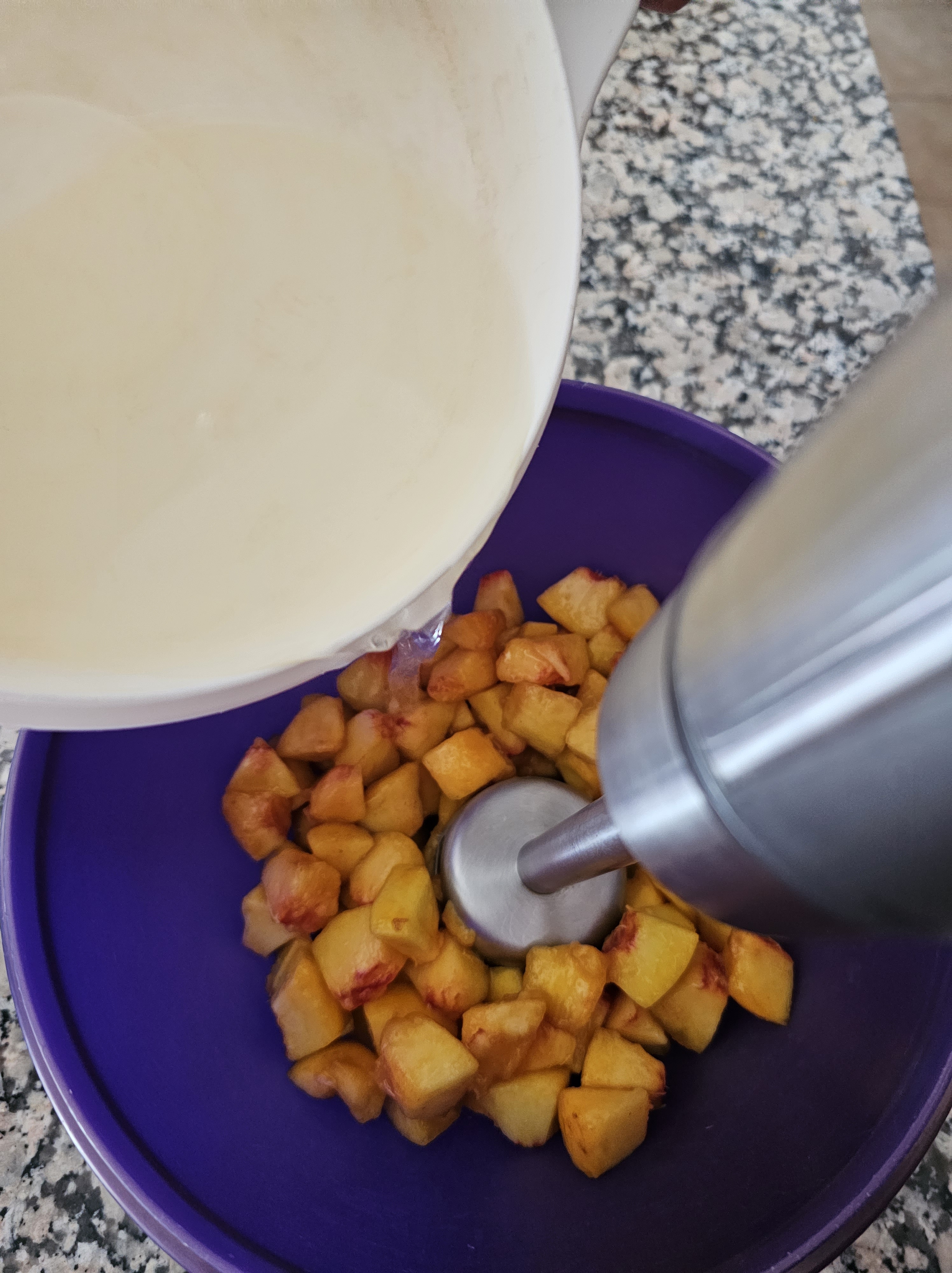 Peel and dice peaches. Place 1/2 cup in a separate bowl.
