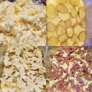 In a 9×13 casserole pan start by lining the bottom of the pan with half of the potatoes. Dollop half the sauce over the potatoes. Cover the sauce with a layer of half of the corned beef followed by a layer of half the cabbage. Continue with the last half of the potatoes. Dollop remaining sauce over the potatoes. Cover the sauce with the remaining corned beef followed by the reaming cabbage.